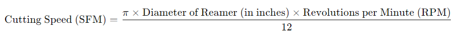 Brzina rezanja, ili površinska brzina, odnosi se na brzinu kojom se oštrica razvrtala pomiče preko obratka. Obično se mjeri u površinskim stopama u minuti (SFM) ili metrima u minuti (m/min). Da biste izračunali odgovarajuću brzinu rezanja za razvrtač, koristite sljedeću formulu: