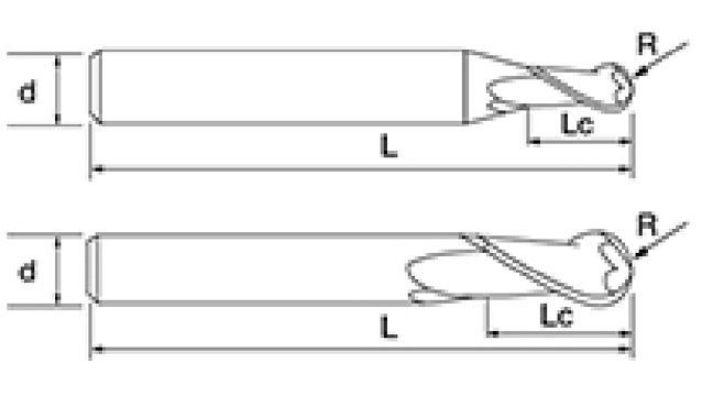 | Serija alata | Promjer | Radijus | Polumjer kuta | Duljina flaute | Efektivna duljina | Ukupna duljina | Dia drške | |||