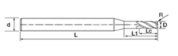 | br. | Promjer D | R kut R | Duljina flaute Lc | Efektivna duljina L1 | Ukupna duljina L | Dia drške d | Broj oštrica F |