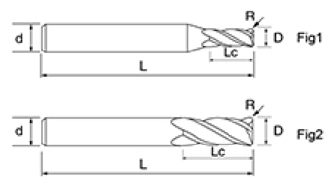 | Serija alata | Promjer | Radijus | Polumjer kuta | Duljina svirale | Efektivna duljina | Ukupna duljina | Dia drške | |||