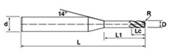 | br. | Promjer D | R kut R | Duljina flaute Lc | Efektivna duljina L1 | Ukupna duljina L | Dia drške d | Broj oštrica F |