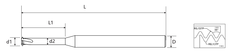| Pitch | Specifikacije | Promjer oštrice d1 | Promjer izbjegavanja d2 | Efektivna duljina oštrice L1 | Promjer ručke D | Ukupna duljina L | Broj oštrica |