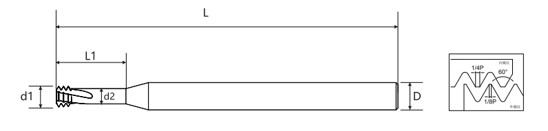 | Pitch | Grubi zubi UNC | Fini zubi UNF | Promjer oštrice d1 | Promjer izbjegavanja d2 | Efektivna duljina oštrice L1 | Promjer ručke D | Ukupna duljina L | Broj oštrica | Promjer donje rupe |