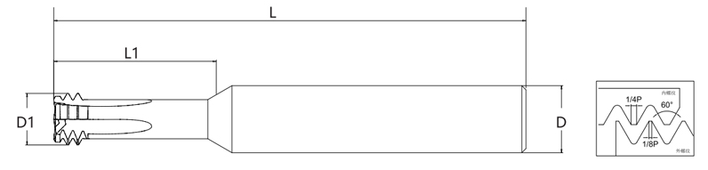 | Pitch | Specifikacije | Promjer oštrice d1 | Promjer izbjegavanja d2 | Efektivna duljina oštrice L1 | Promjer ručke D | Ukupna duljina L | Broj oštrica |